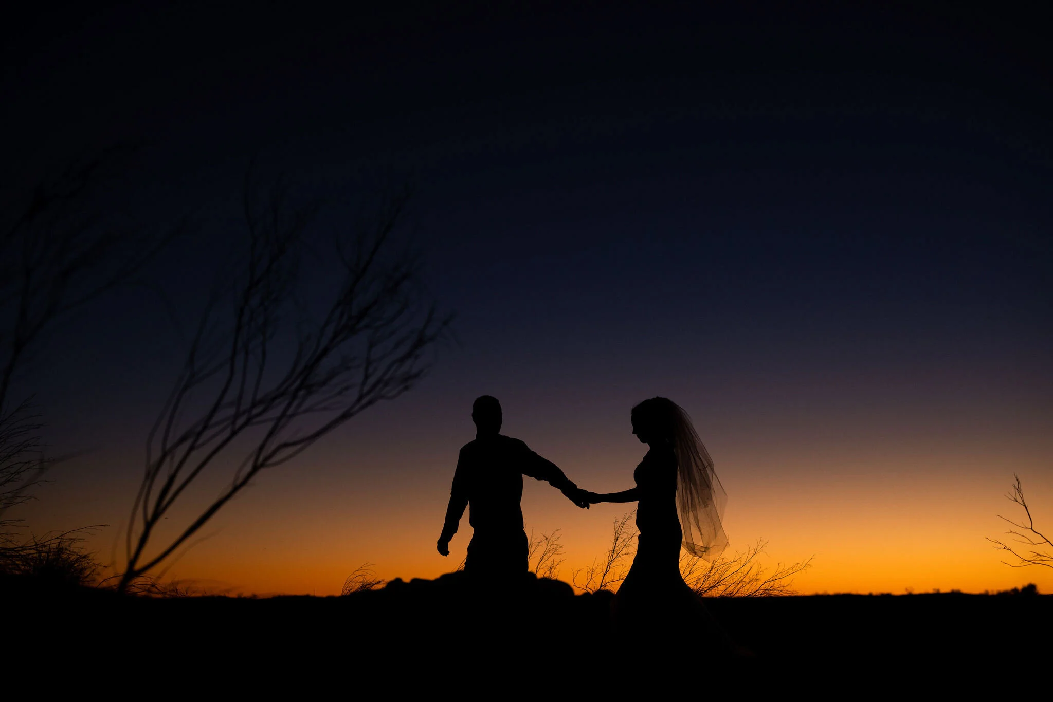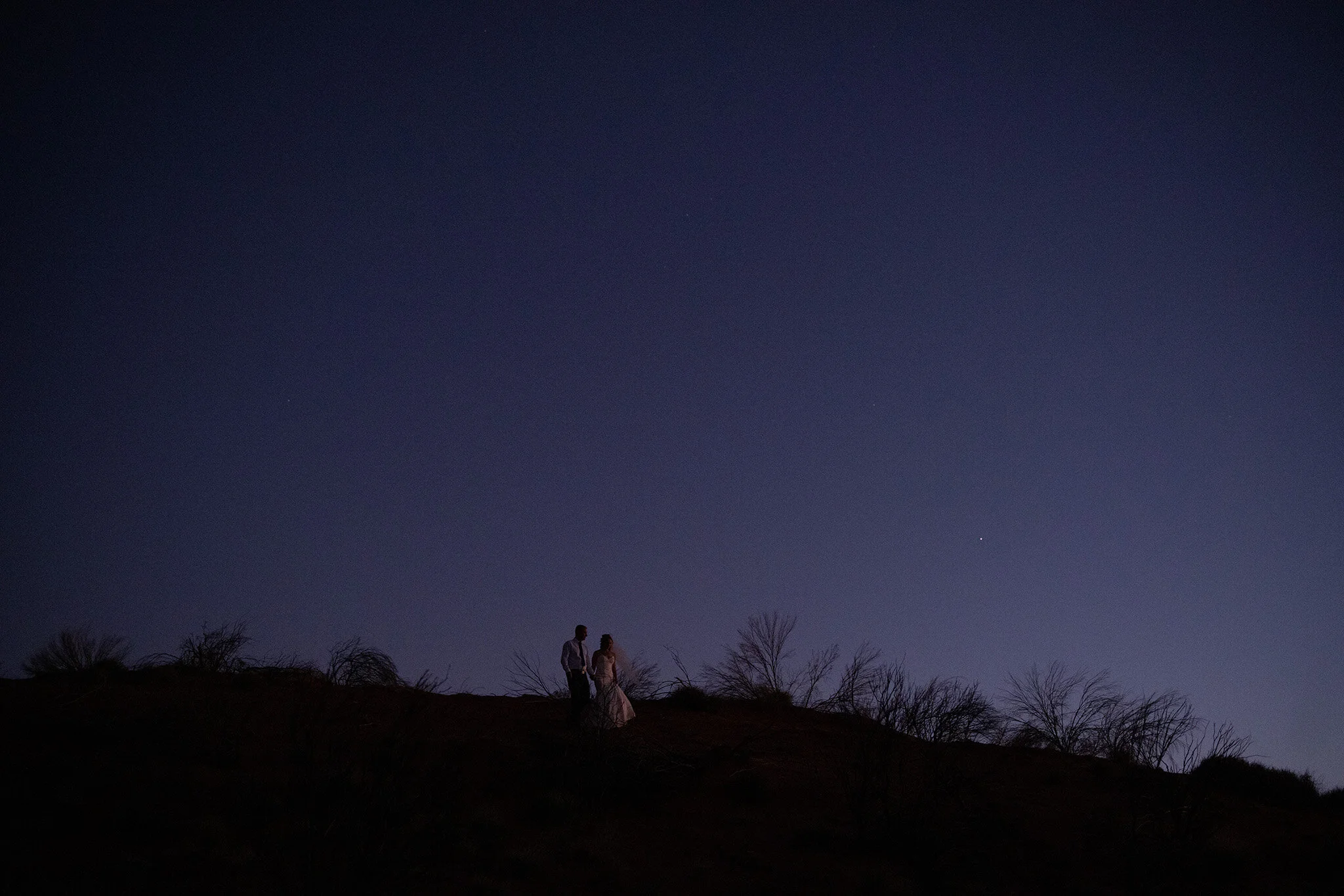 We decided to get a bit closer to Uluru as the sunset was was upon us. On our location scout the day before the elopement we found these epic trees that we know would create an amazing outback silhouette once the sun had gone down, with Katu Tjata on one side, and Uluru on the other. These shots were taken about 30-40 minutes after the sun had dropped below the horizon.