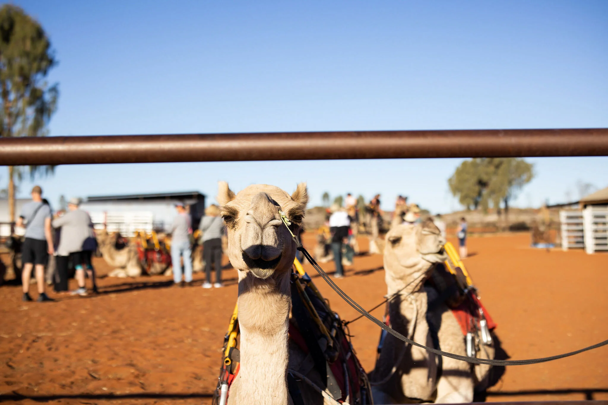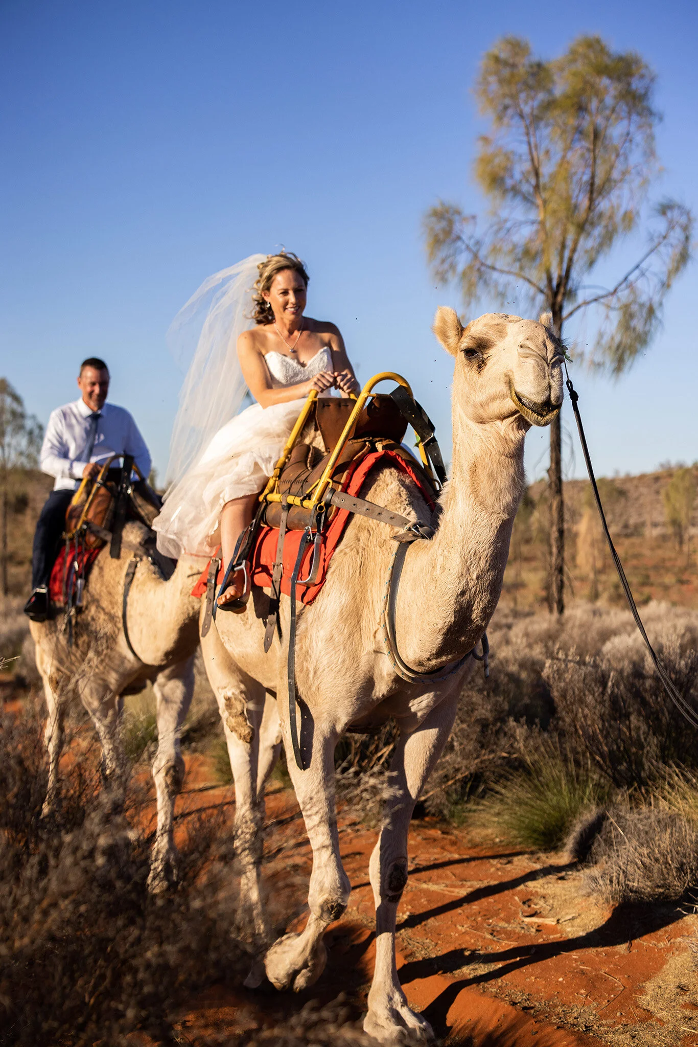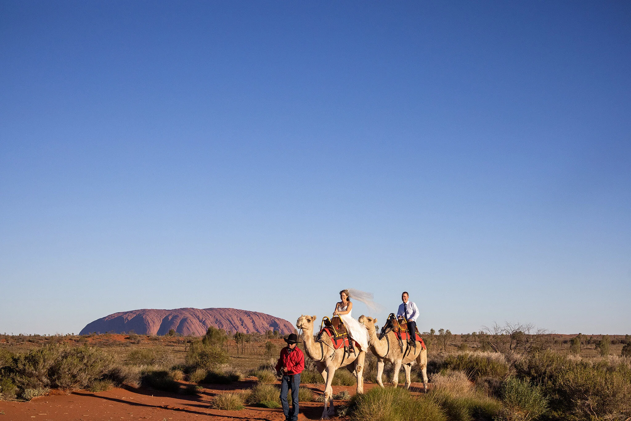Jason and Janelle on the way to their ceremony on camel back with Katu Tjata in the background