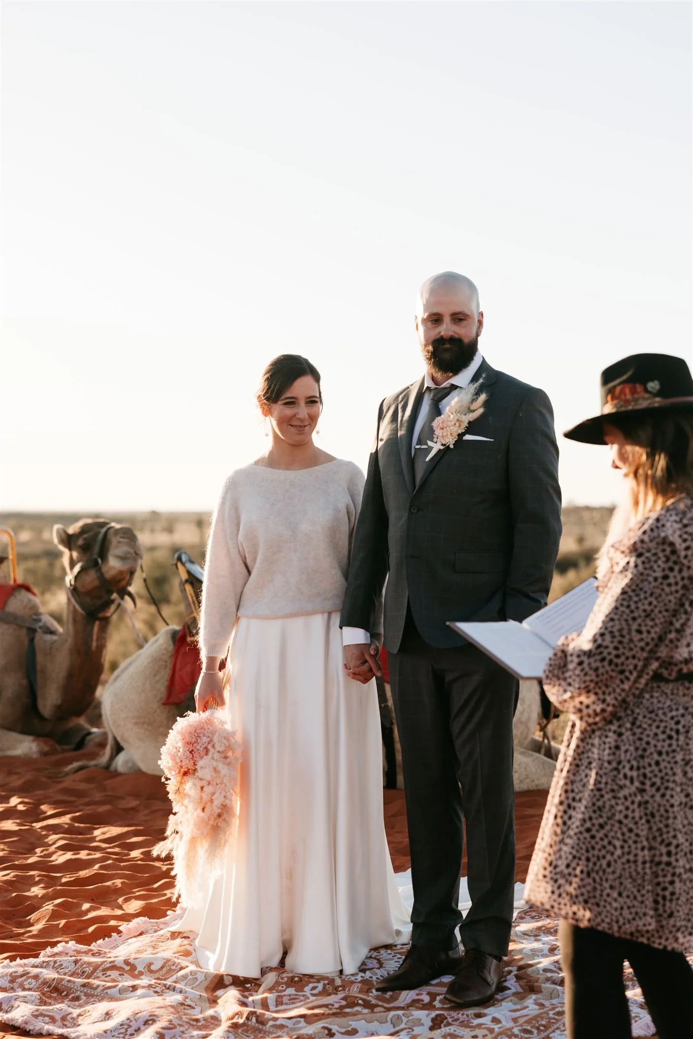 Sunrise weddings mean early starts and brisk desert mornings. Bundled up under festoon lights at the Camel Farm, Taegan and Sam shared an emotional first look before saddling up the camels — Charlie safely in his dune buggy — and heading across the red dunes to their ceremony spot. As the first golden light kissed the earth, they exchanged vows in a place that felt timeless, with nothing but open skies and endless horizons around them.
