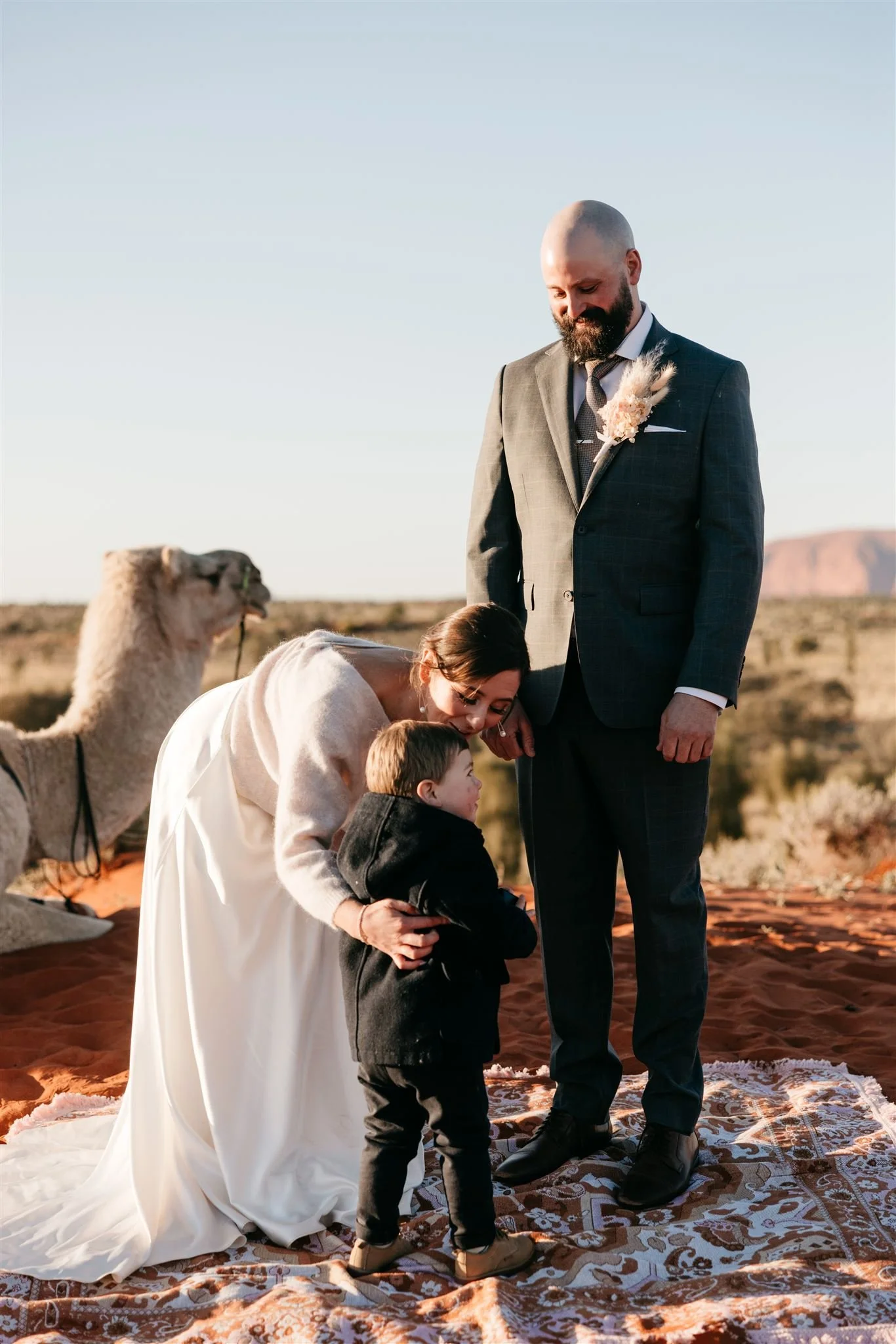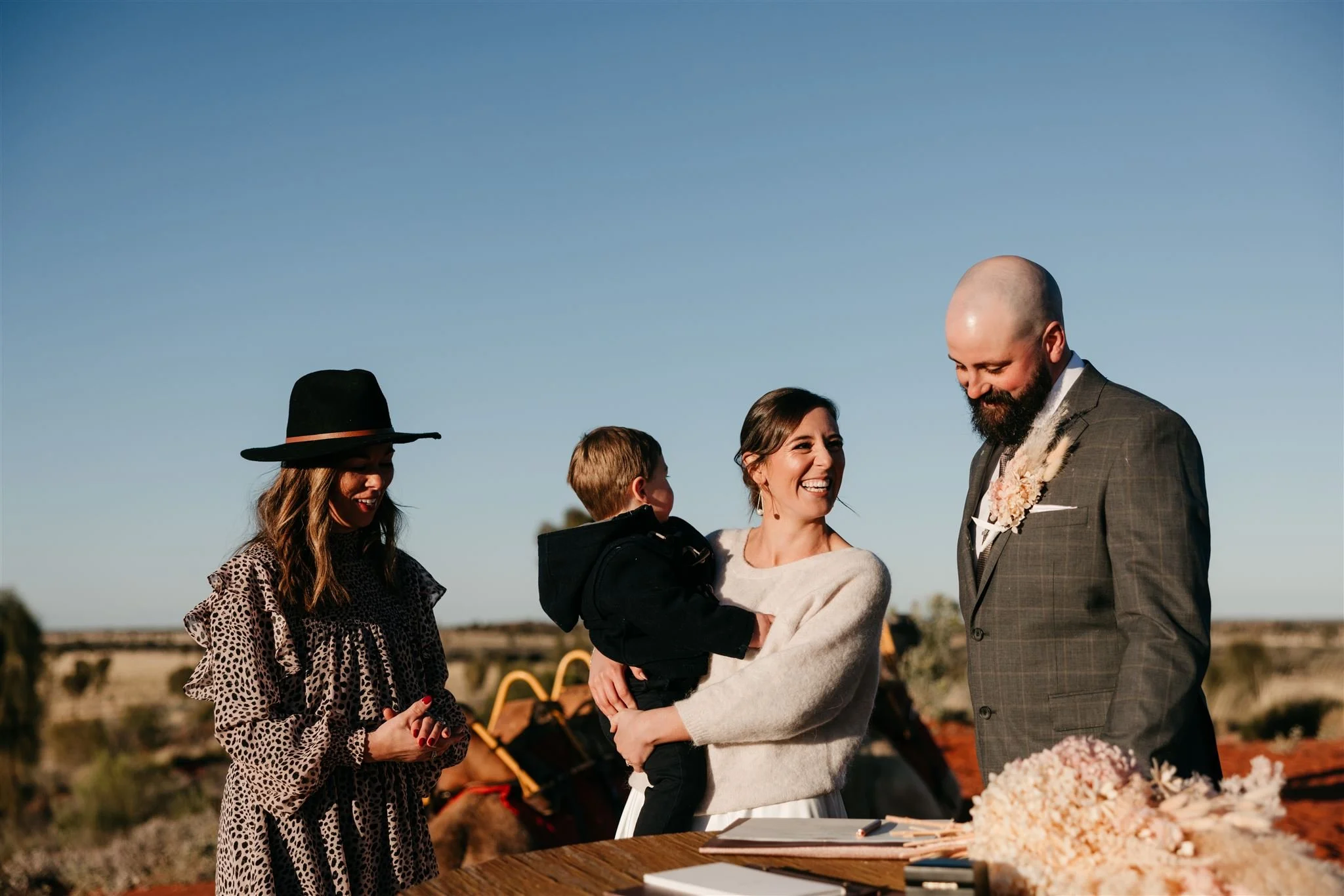 Little Charlie stole the show as the proud ring bearer — with a picnic rug as backup (because you don’t want to lose a ring in that soft red sand!). It’s these small, genuine moments that make a wedding unforgettable.