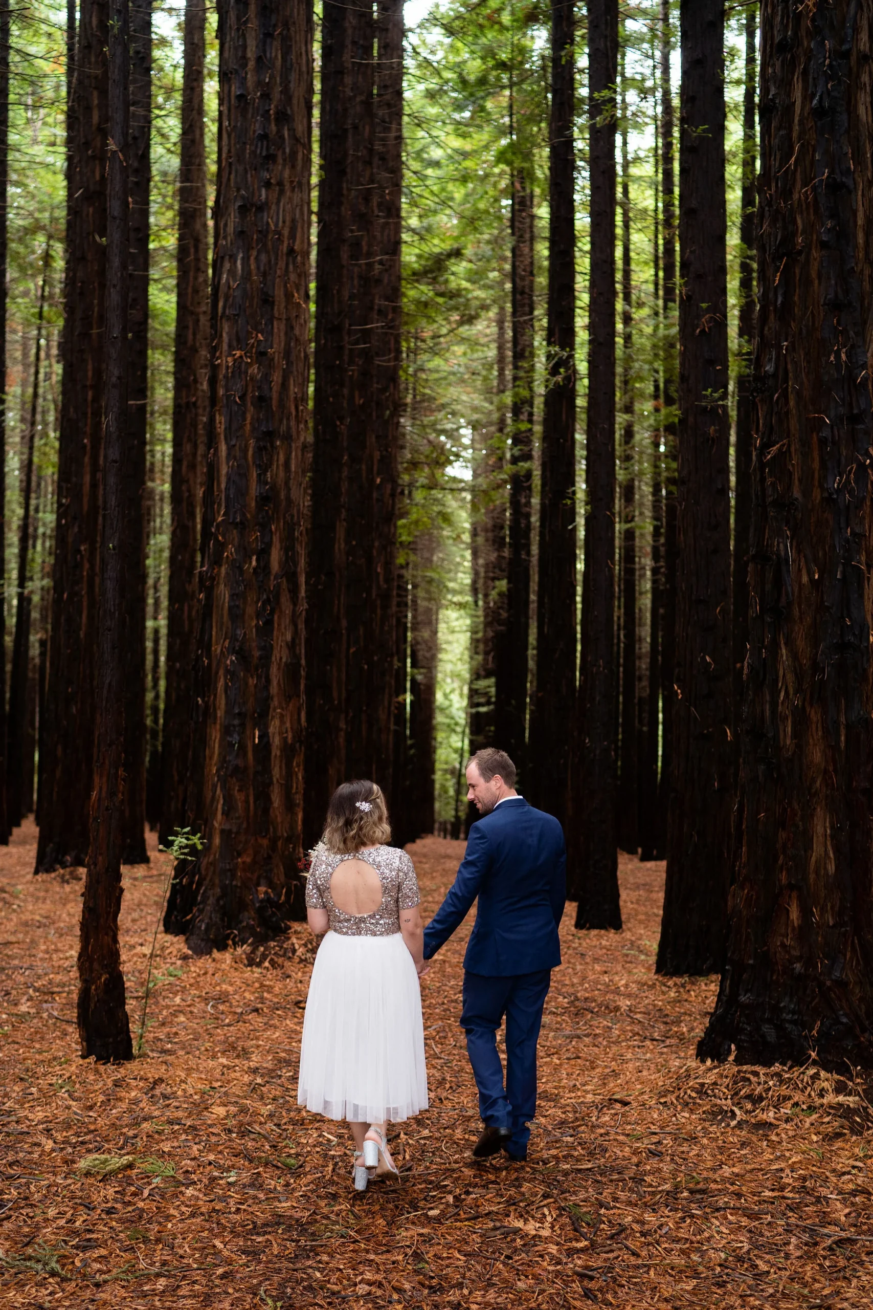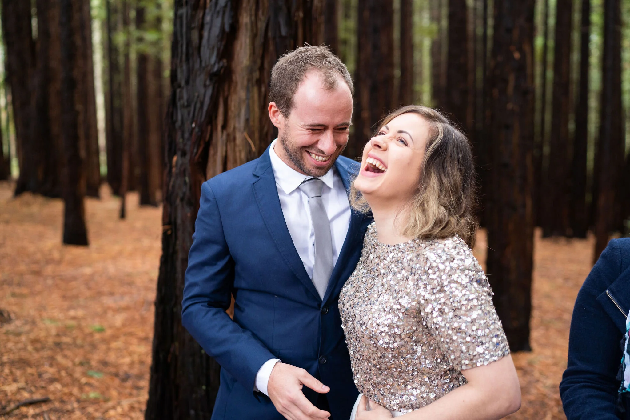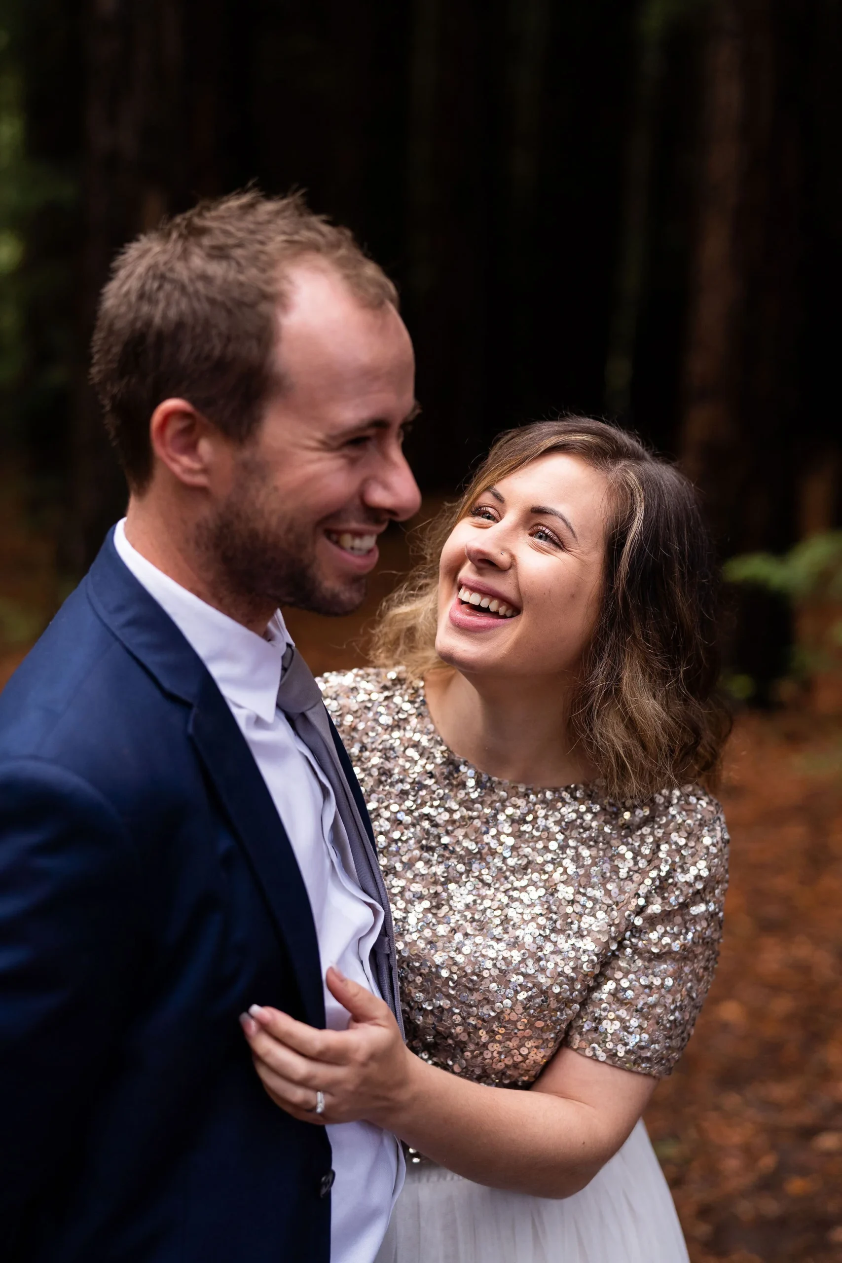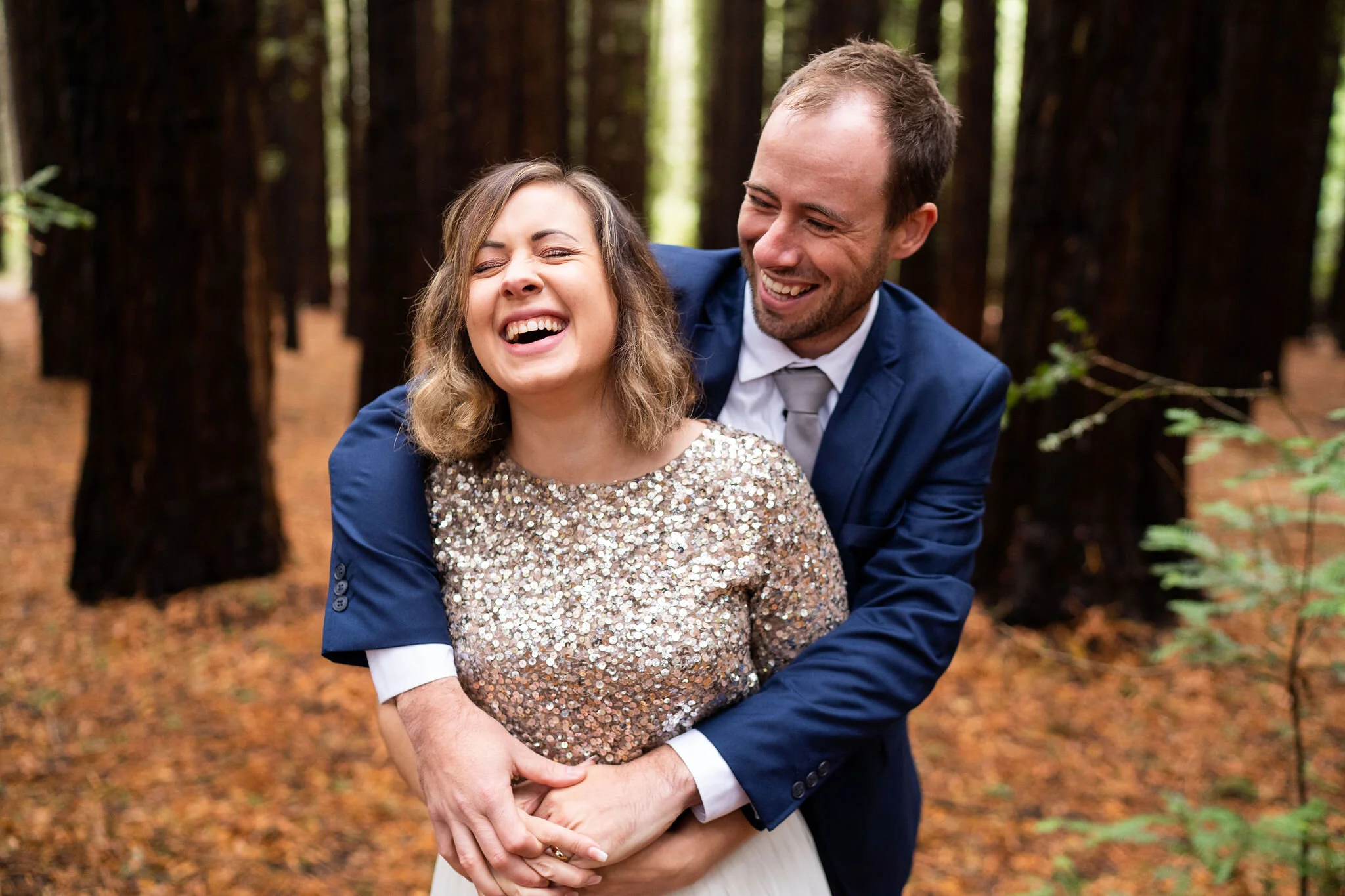 Angela looking gorgeous in a two piece sparkling keyhole back top and tea length skirt and Callum looking dapper in navy, there was plenty of laughs and love for photo time under the towering trees.