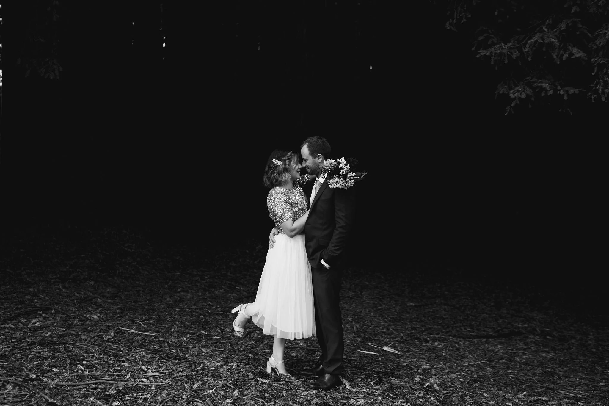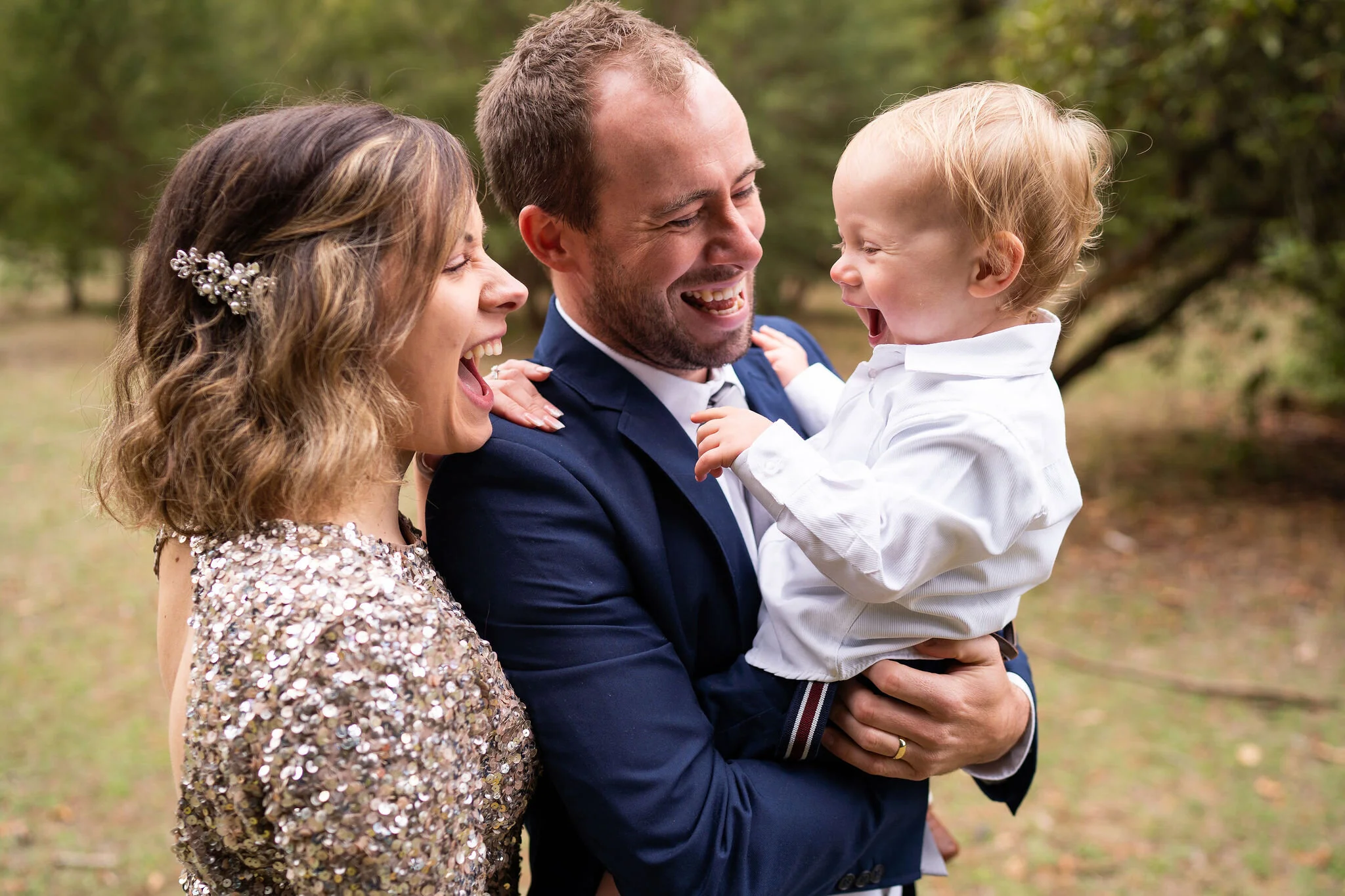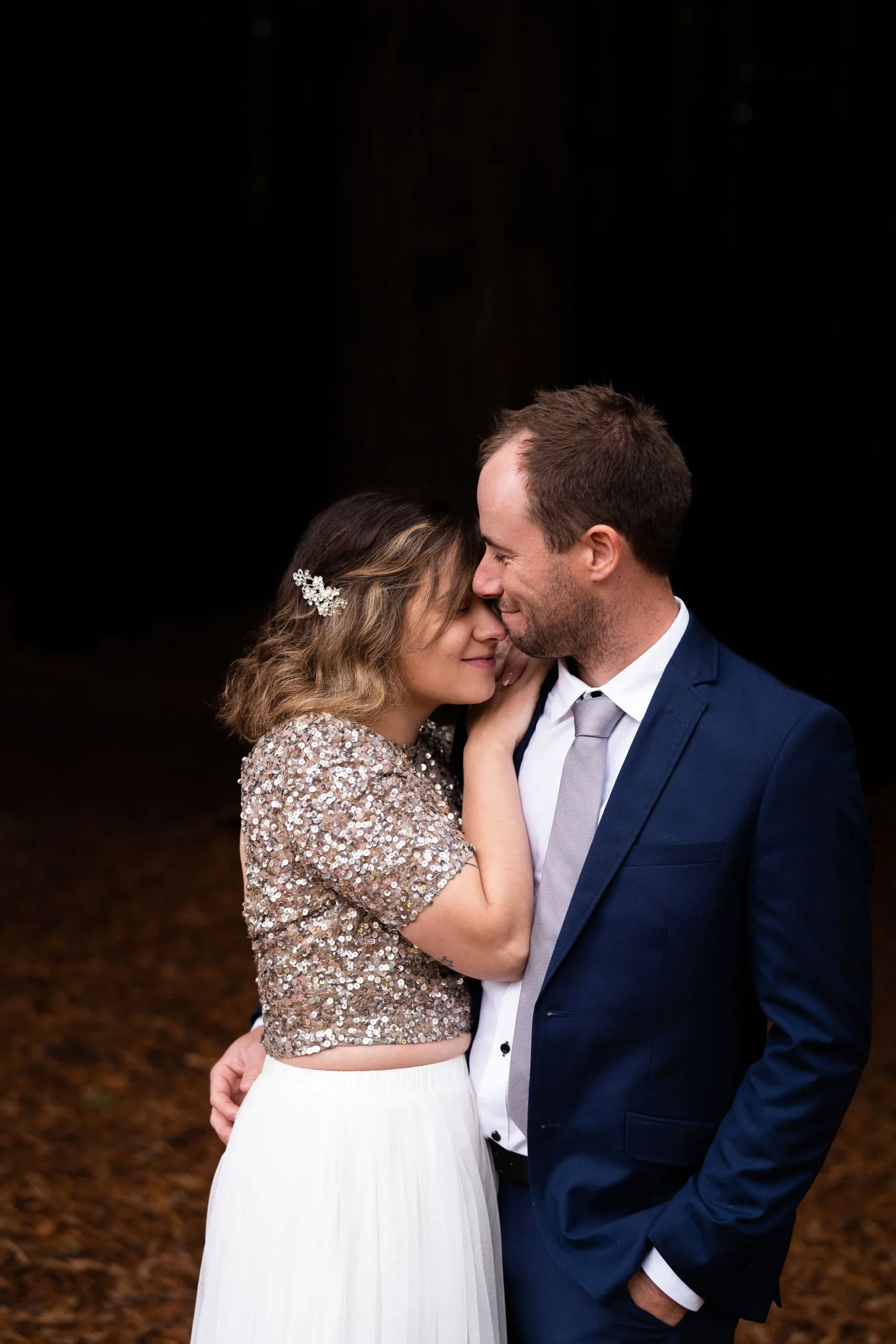 Angela looking gorgeous in a two piece sparkling keyhole back top and tea length skirt and Callum looking dapper in navy, there was plenty of laughs and love for photo time under the towering trees.