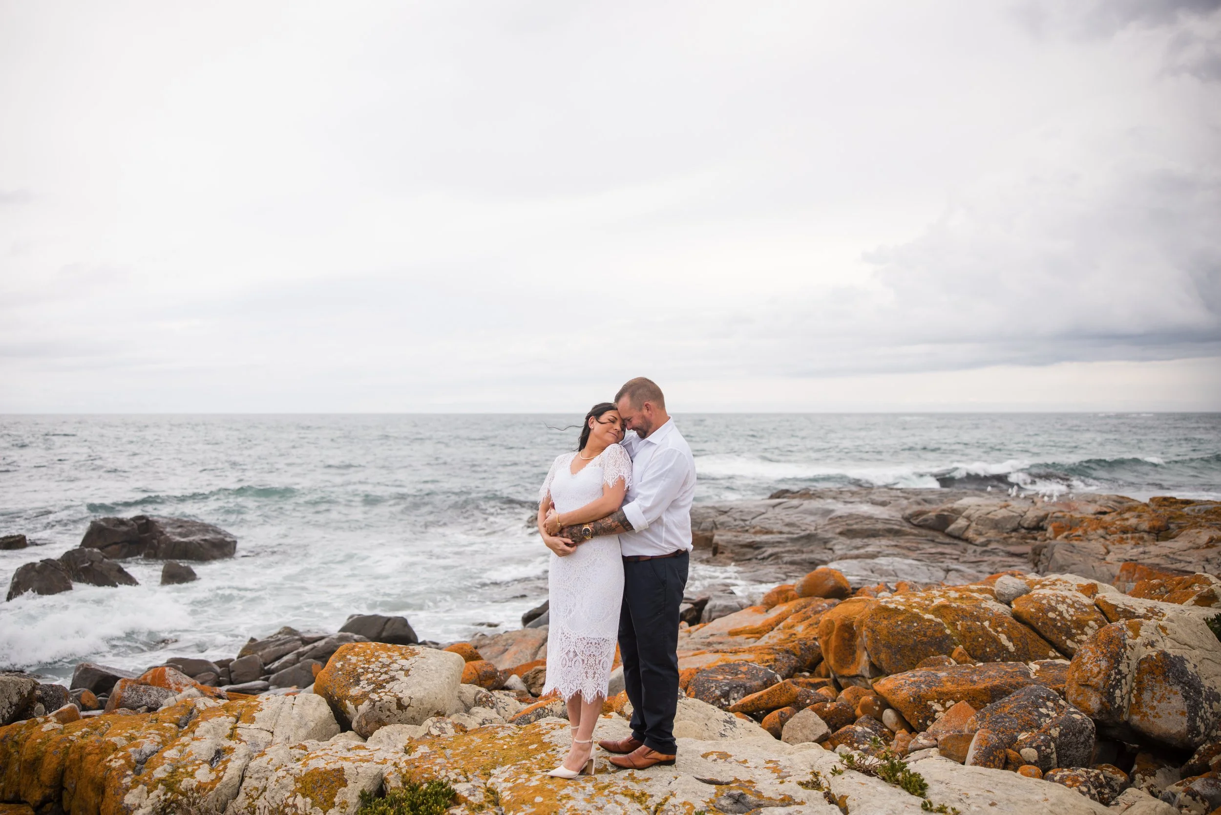 Stunning coastline, red blushed rocks, not very many tourists. So many options here for your elopement or micro wedding with a view. There is a beach option in this area that is truly stunning with the whitest sands and bluest seas and those red tinged rocks, which in our opinion rivals the more popular tourist destination of Wine glass bay in Freycinet national park. Hiking can be avoided to access this location, and there is a bevvy of air bnb options to stay after your miro wedding and plenty tio dicsover in the area for your honeymoon afterwards.